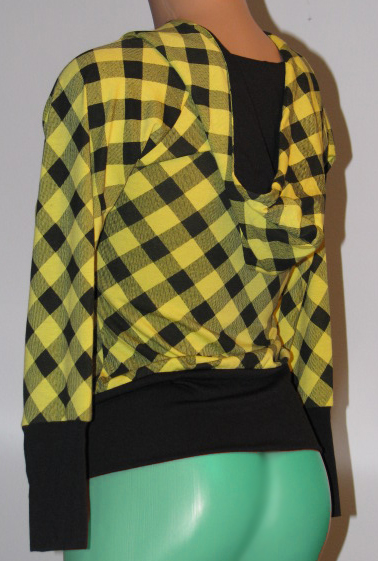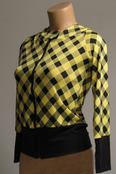 This cute hoodie comes with yellow and black checkers as shown. The front zips up and there is a little velcro closure at the top. Comfortable and classy looking.