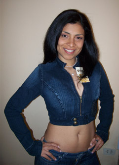 These tops are from Peru and might be slighty smaller than american versions. The model is wearing a medium. She is 5' 3" and weighs 121 lbs. The fashion of these jeans jacket tops comes with a little longer sleeve as seen in photo. The material is a lightweight jeans material. It is comfortable and sexy.